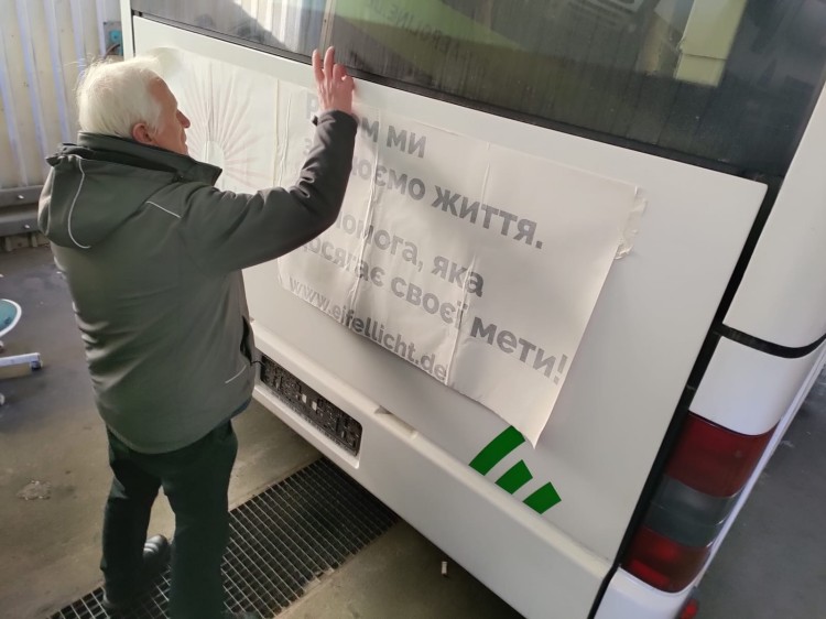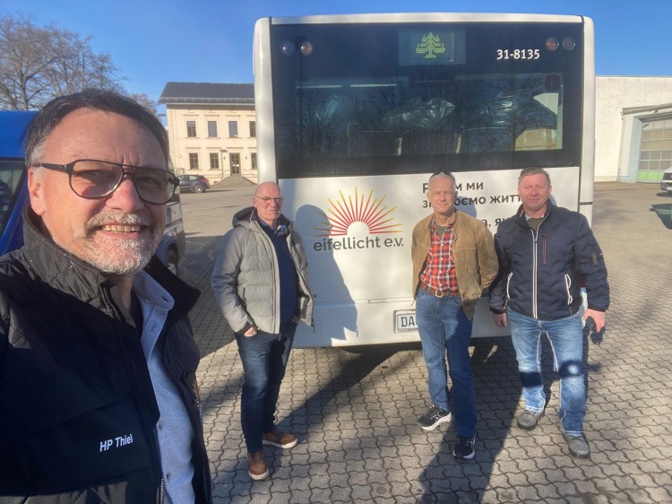 Zwei Eifellicht-Teams hatten zuvor 4,5 Tonnen Winterkleidung, Schuhe und Bettwäsche (440 Kartons) nach Lugau im Erzgebirge transportiert und den vom Regionalverkehr Erzgebirge GmbH aus Lugau gespendeten Omnibus für den Hilfstransport vorbereitet. Ein freiwilliger Fahrer des Partnervereins St. Augustin & Friends hilft überführte den Bus bis zur ukrainischen Grenze.